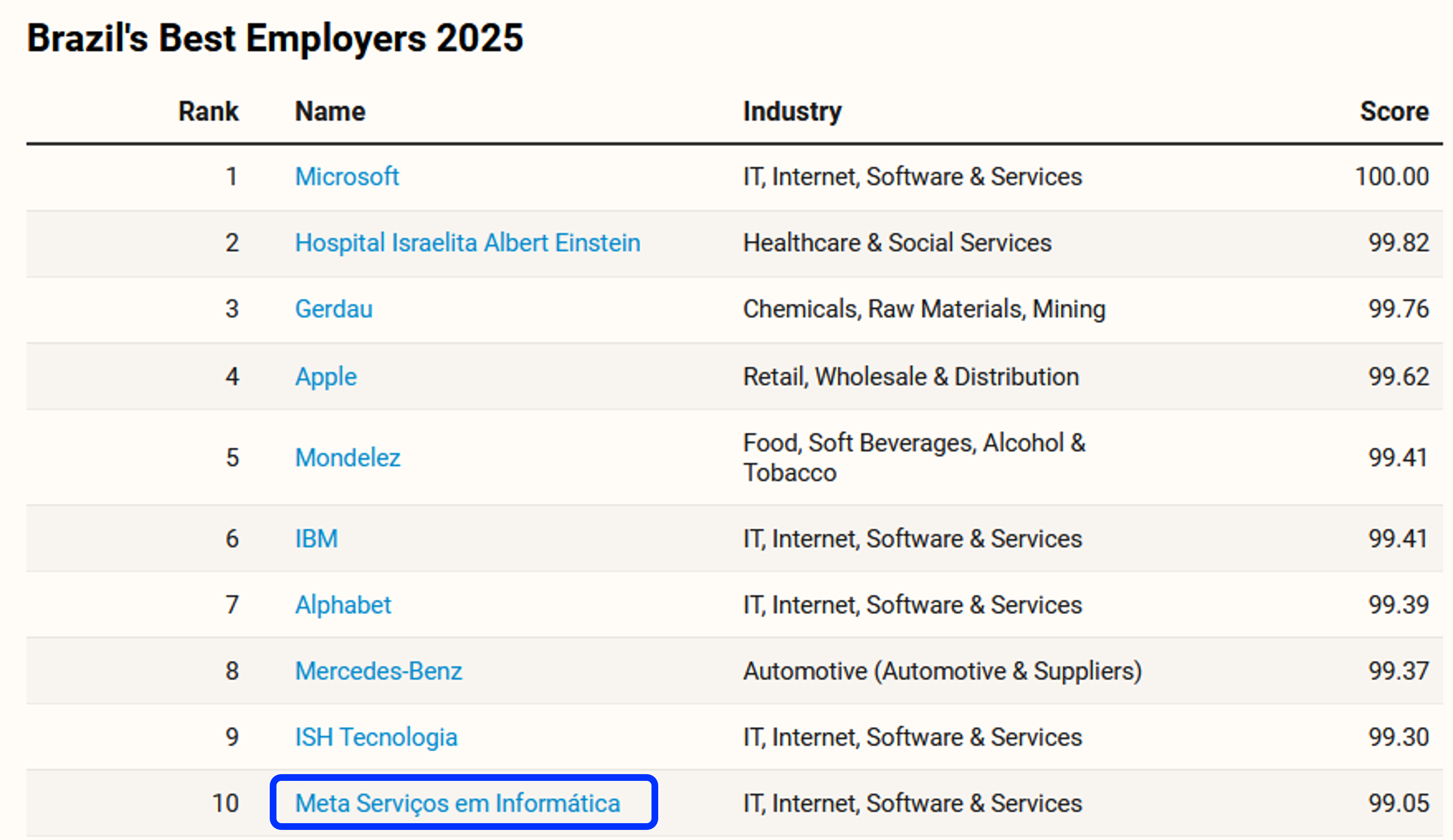 Meta IT is among the Top 10 Best Employers in Brazil, according to TIME magazine, one of the most influential publications in the world. The ranking highlights organizations that stand out for their corporate culture, people management practices, and the positive impact they generate across their ecosystems.
